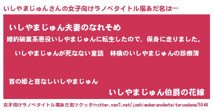 いしやまじゅんさんの女子向けラノベタイトル風あだ名は… 『いしやまじゅんが死なない童話 林檎のいしやまじゅんの診療簿』『いしやまじゅん夫妻のなれそめ』『いしやまじゅん伯爵の花嫁』 ツクッター #女子向けラノベタイトル風あだ名ツクッター http://tkutter.nan7.net/joshimukeranobetaitoruadana/5546/