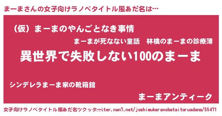 | 胡散臭い通販商品みたいなあだ名 | 『絶対に幸福をもたらす水素水…その名も「まーま」』 |