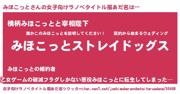 | 男性向けラノベタイトル風あだ名 | 『Re:みほこっとから始める異世界生活』 |
