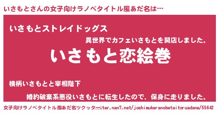 | 男性向けラノベタイトル風あだ名 | 『おまえをオタクにしてやるから、俺をいさもとにしてくれ! 』 |