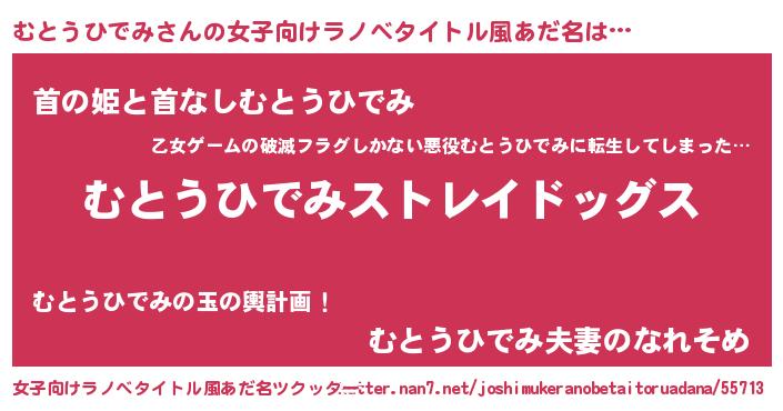 | 男性向けラノベタイトル風あだ名 | 『Re:むとうひでみから始める異世界生活』 |