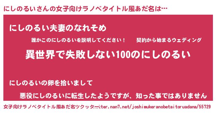 | 胡散臭い通販商品みたいなあだ名 | 『絶対に幸福をもたらす水素水…その名も「にしのるい」』 |