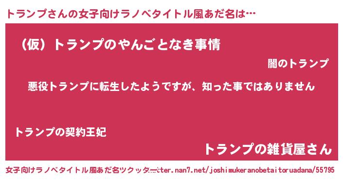 | 胡散臭い通販商品みたいなあだ名 | 『あなたにだけ特別に提供する100年もののヴィンテージワイン…その名も「トランプ」』 |