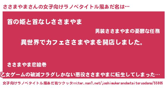 | 男性向けラノベタイトル風あだ名 | 『誰もが恐れるあのささまやまが、ぼくの専属メイドになるようです。』 |