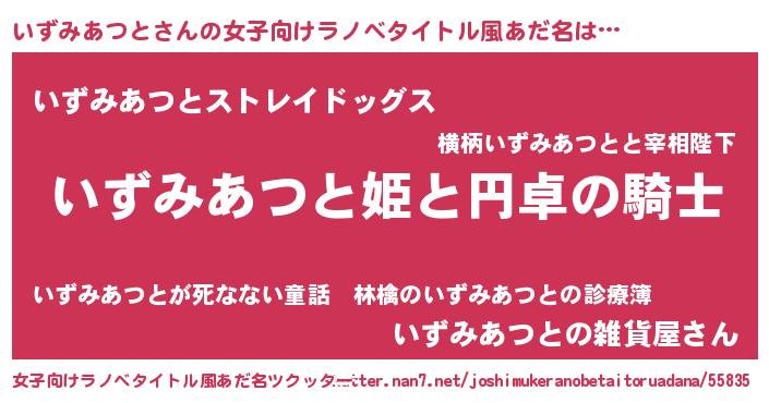 いずみあつとさんの女子向けラノベタイトル風あだ名は… 『いずみあつと姫と円卓の騎士』『いずみあつとストレイドッグス』『いずみあつとの雑貨屋さん』 ツクッター #女子向けラノベタイトル風あだ名ツクッター http://tkutter.nan7.net/joshimukeranobetaitoruadana/55835/