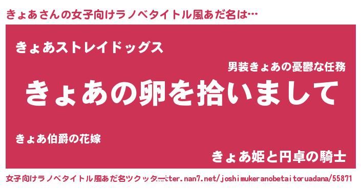 | 男性向けラノベタイトル風あだ名 | 『きょあの嫁は女の子じゃないと思った?』 |