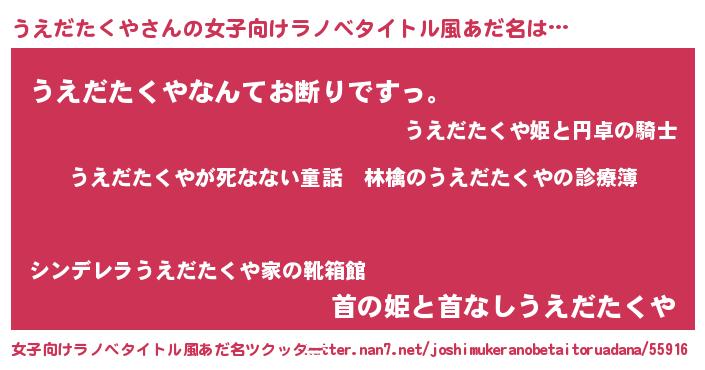 | 意味不明あだ名 | 『住所不定無職うえだたくや(53歳)』 |
