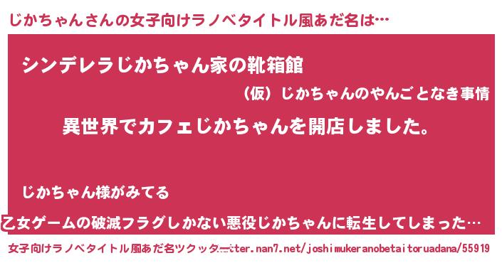 じかちゃんさんの女子向けラノベタイトル風あだ名は… 『異世界でカフェじかちゃんを開店しました。』『シンデレラじかちゃん家の靴箱館』『乙女ゲームの破滅フラグしかない悪役じかちゃんに転生してしまった…』 ツクッター #女子向けラノベタイトル風あだ名ツクッター http://tkutter.nan7.net/joshimukeranobetaitoruadana/55919/
