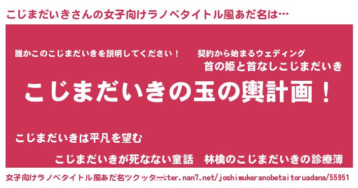 | 男性向けラノベタイトル風あだ名 | 『こじまだいき~年齢イコール彼女いない歴の魔法使い~』 |