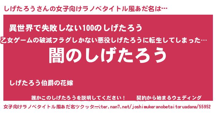 | 男性向けラノベタイトル風あだ名 | 『Re:しげたろうから始める異世界生活』 |