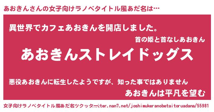 | 男性向けラノベタイトル風あだ名 | 『Re:あおきんから始める異世界生活』 |