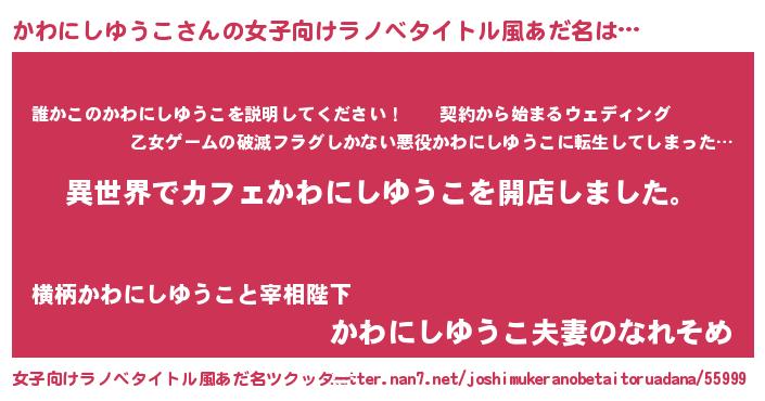 | 男性向けラノベタイトル風あだ名 | 『誰もが恐れるあのかわにしゆうこが、ぼくの専属メイドになるようです。』 |
