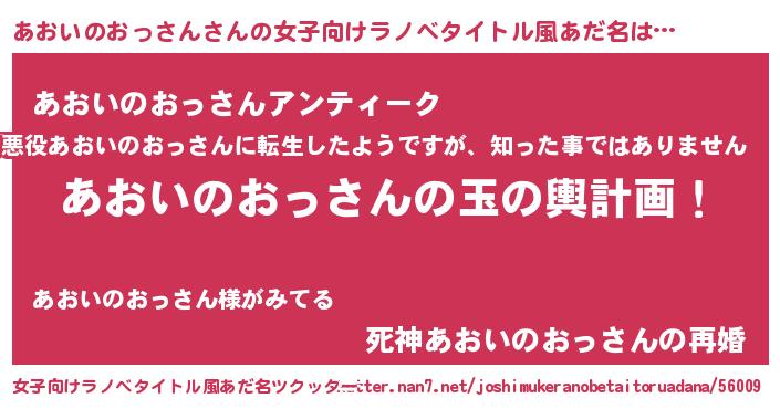 | 男性向けラノベタイトル風あだ名 | 『あおいのおっさん~年齢イコール彼女いない歴の魔法使い~』 |