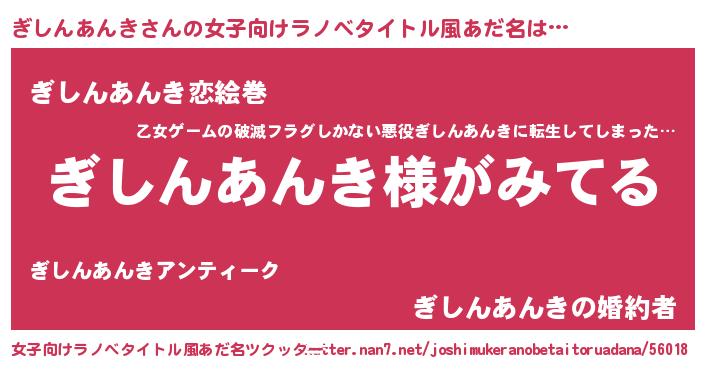 ぎしんあんきさんの女子向けラノベタイトル風あだ名は… 『ぎしんあんき様がみてる』『ぎしんあんき恋絵巻』『ぎしんあんきの婚約者』 ツクッター #女子向けラノベタイトル風あだ名ツクッター http://tkutter.nan7.net/joshimukeranobetaitoruadana/56018/