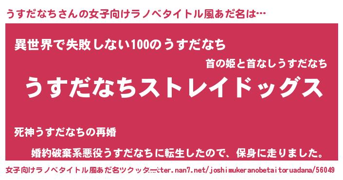 | 男性向けラノベタイトル風あだ名 | 『Re:うすだなちから始める異世界生活』 |