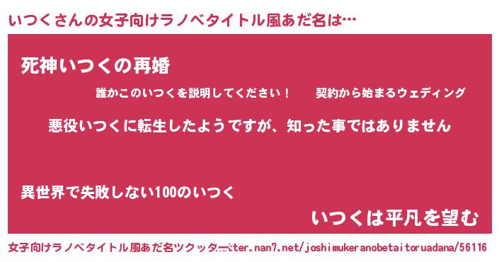 | 男性向けラノベタイトル風あだ名 | 『この素晴らしい世界にいつくを!』 |