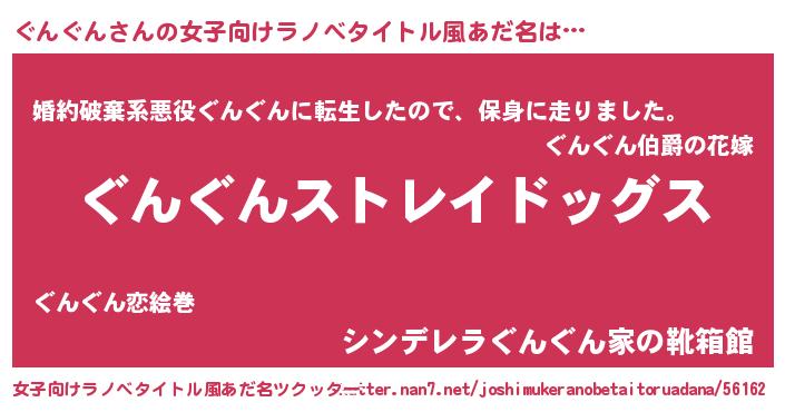 | 男性向けラノベタイトル風あだ名 | 『Re:ぐんぐんから始める異世界生活』 |