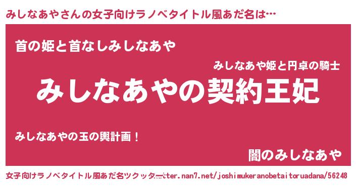 | 胡散臭い通販商品みたいなあだ名 | 『来世でも幸せになれる健康食品…その名も「みしなあや」』 |