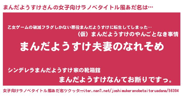 | 男性向けラノベタイトル風あだ名 | 『おまえをオタクにしてやるから、俺をまんだようすけにしてくれ! 』 |
