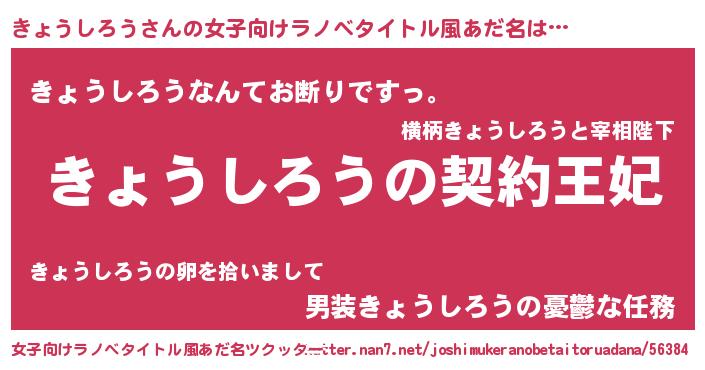 | 男性向けラノベタイトル風あだ名 | 『きょうしろうという概念が存在しない退屈な世界 』 |