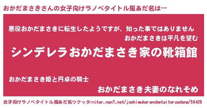 おかだまさきさんの女子向けラノベタイトル風あだ名は… 『シンデレラおかだまさき家の靴箱館』『悪役おかだまさきに転生したようですが、知った事ではありません』『おかだまさき夫妻のなれそめ』 ツクッター #女子向けラノベタイトル風あだ名ツクッター http://tkutter.nan7.net/joshimukeranobetaitoruadana/56428/