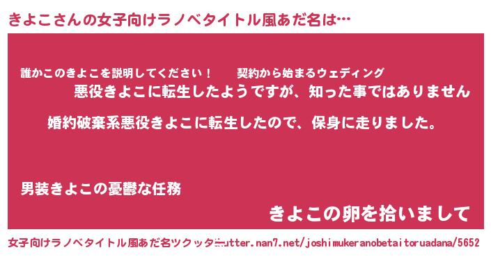 きよこさんの女子向けラノベタイトル風あだ名は… 『婚約破棄系悪役きよこに転生したので、保身に走りました。』『誰かこのきよこを説明してください! ~契約から始まるウェディング~』『きよこの卵を拾いまして』 ツクッター #女子向けラノベタイトル風あだ名ツクッター http://tkutter.nan7.net/joshimukeranobetaitoruadana/5652/