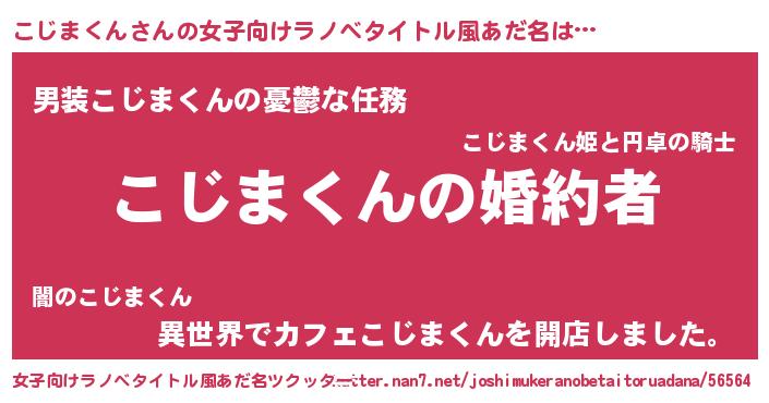 こじまくんさんの女子向けラノベタイトル風あだ名は… 『こじまくんの婚約者』『男装こじまくんの憂鬱な任務』『異世界でカフェこじまくんを開店しました。』 ツクッター #女子向けラノベタイトル風あだ名ツクッター http://tkutter.nan7.net/joshimukeranobetaitoruadana/56564/