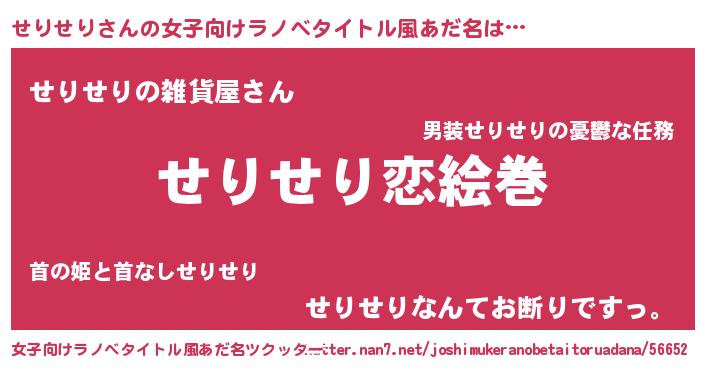| 男性向けラノベタイトル風あだ名 | 『おまえをオタクにしてやるから、俺をせりせりにしてくれ! 』 |