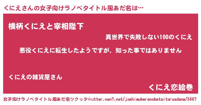 | 男性向けラノベタイトル風あだ名 | 『この素晴らしい世界にくにえを!』 |