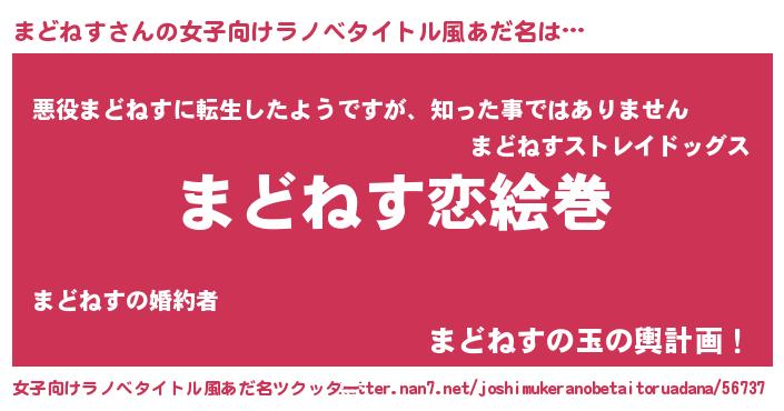 | 男性向けラノベタイトル風あだ名 | 『おまえをオタクにしてやるから、俺をまどねすにしてくれ! 』 |