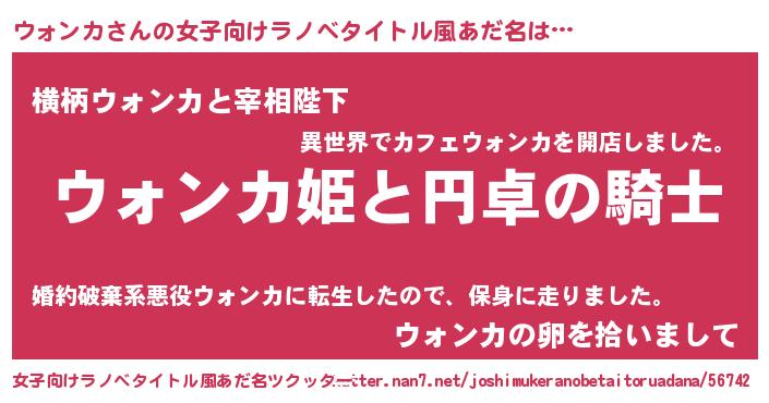 ウォンカさんの女子向けラノベタイトル風あだ名は… 『ウォンカ姫と円卓の騎士』『横柄ウォンカと宰相陛下』『ウォンカの卵を拾いまして』 ツクッター #女子向けラノベタイトル風あだ名ツクッター http://tkutter.nan7.net/joshimukeranobetaitoruadana/56742/