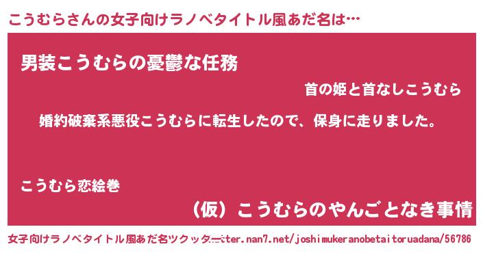 | 男性向けラノベタイトル風あだ名 | 『転生したらこうむらだった件』 |