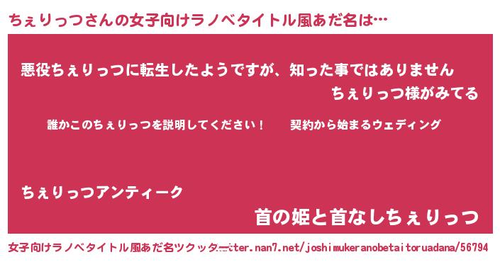 | 胡散臭い通販商品みたいなあだ名 | 『億万長者になれるブレスレット…その名も「ちぇりっつ」』 |