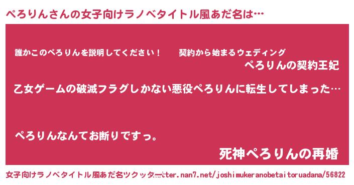 ぺろりんさんの女子向けラノベタイトル風あだ名は… 『乙女ゲームの破滅フラグしかない悪役ぺろりんに転生してしまった…』『誰かこのぺろりんを説明してください! ~契約から始まるウェディング~』『死神ぺろりんの再婚』 ツクッター #女子向けラノベタイトル風あだ名ツクッター http://tkutter.nan7.net/joshimukeranobetaitoruadana/56822/