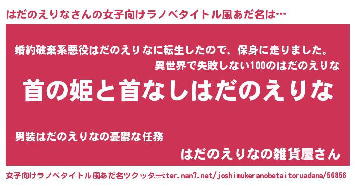 | 男性向けラノベタイトル風あだ名 | 『はたらくはだのえりなさま!』 |