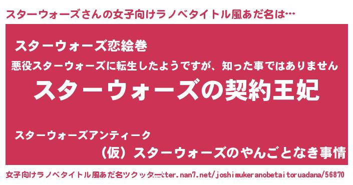 | 男性向けラノベタイトル風あだ名 | 『誰もが恐れるあのスターウォーズが、ぼくの専属メイドになるようです。』 |