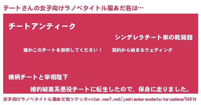 | 男性向けラノベタイトル風あだ名 | 『チートアートオンライン』 |