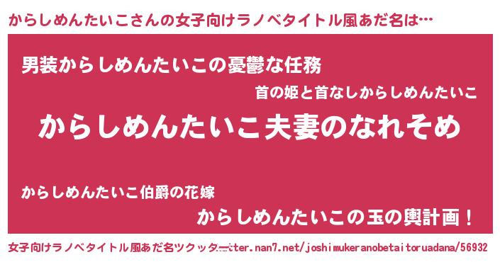 | 男性向けラノベタイトル風あだ名 | 『おまえをオタクにしてやるから、俺をからしめんたいこにしてくれ! 』 |