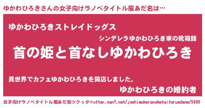 ゆかわひろきさんの女子向けラノベタイトル風あだ名は… 『首の姫と首なしゆかわひろき』『ゆかわひろきストレイドッグス』『ゆかわひろきの婚約者』 ツクッター #女子向けラノベタイトル風あだ名ツクッター http://tkutter.nan7.net/joshimukeranobetaitoruadana/5695/