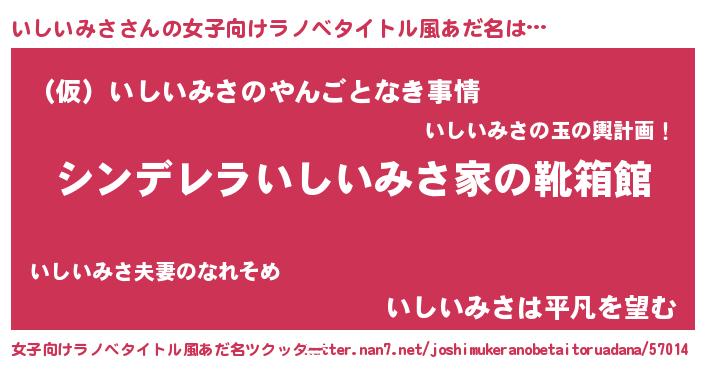 いしいみささんの女子向けラノベタイトル風あだ名は… 『シンデレラいしいみさ家の靴箱館』『(仮)いしいみさのやんごとなき事情』『いしいみさは平凡を望む』 ツクッター #女子向けラノベタイトル風あだ名ツクッター http://tkutter.nan7.net/joshimukeranobetaitoruadana/57014/