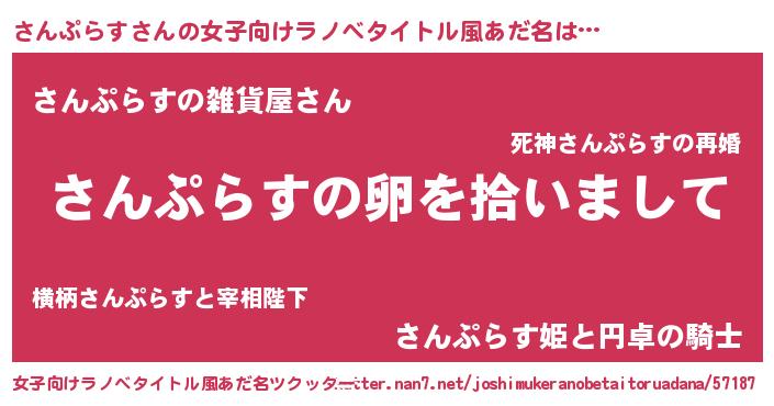 | 男性向けラノベタイトル風あだ名 | 『さんぷらすの嫁は女の子じゃないと思った?』 |