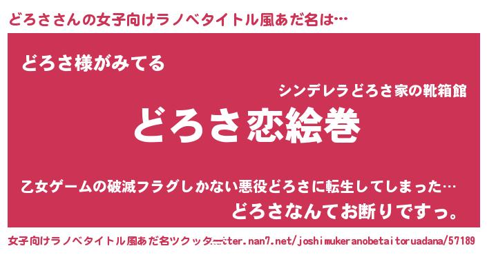 | 男性向けラノベタイトル風あだ名 | 『おまえをオタクにしてやるから、俺をどろさにしてくれ! 』 |