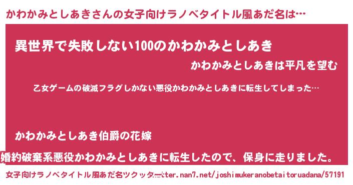 | 男性向けラノベタイトル風あだ名 | 『この素晴らしい世界にかわかみとしあきを!』 |