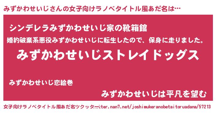 | 男性向けラノベタイトル風あだ名 | 『Re:みずかわせいじから始める異世界生活』 |