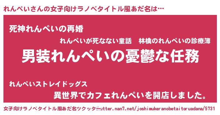| 男性向けラノベタイトル風あだ名 | 『うちのれんぺいが世界を掌握している!』 |