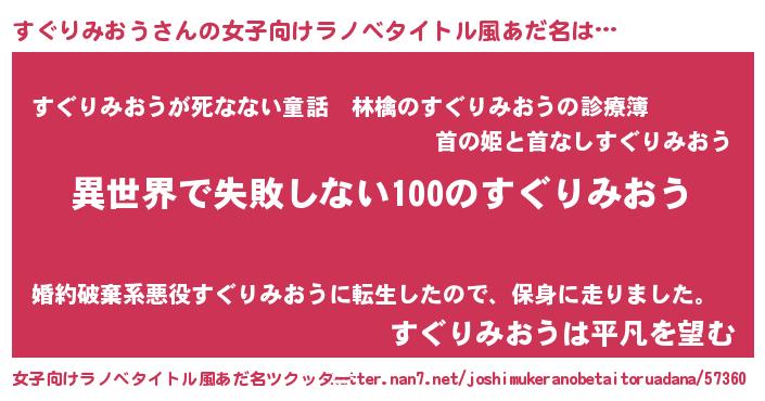 | 男性向けラノベタイトル風あだ名 | 『すぐりみおうという概念が存在しない退屈な世界 』 |