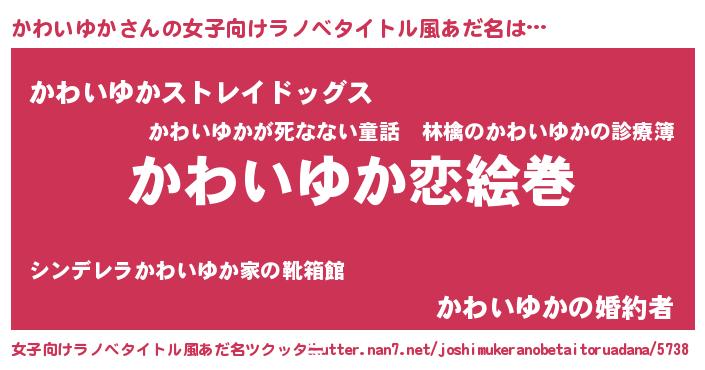 | 男性向けラノベタイトル風あだ名 | 『おまえをオタクにしてやるから、俺をかわいゆかにしてくれ! 』 |