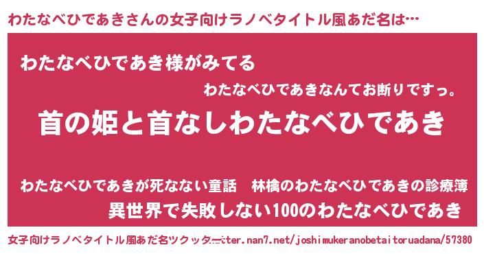 | 男性向けラノベタイトル風あだ名 | 『はたらくわたなべひであきさま!』 |