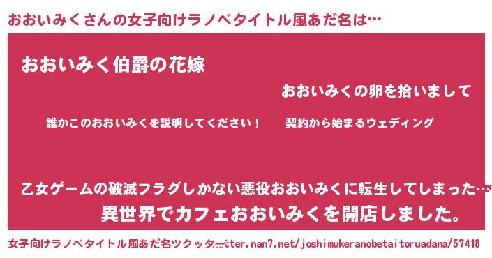 | 男性向けラノベタイトル風あだ名 | 『オオイミクアートオンライン』 |