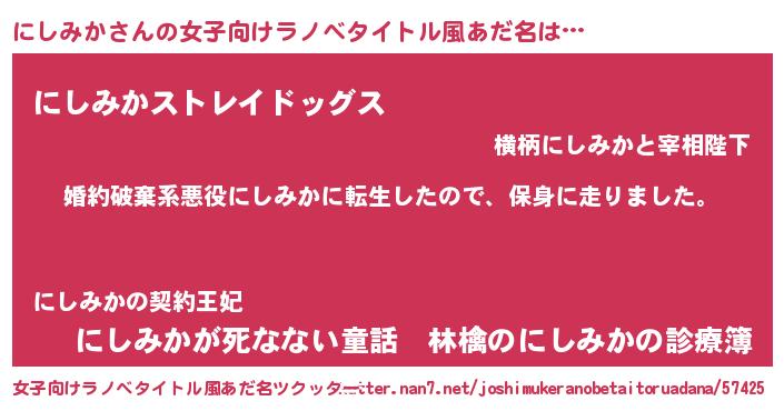 にしみかさんの女子向けラノベタイトル風あだ名は… 『婚約破棄系悪役にしみかに転生したので、保身に走りました。』『にしみかストレイドッグス』『にしみかが死なない童話 林檎のにしみかの診療簿』 ツクッター #女子向けラノベタイトル風あだ名ツクッター http://tkutter.nan7.net/joshimukeranobetaitoruadana/57425/